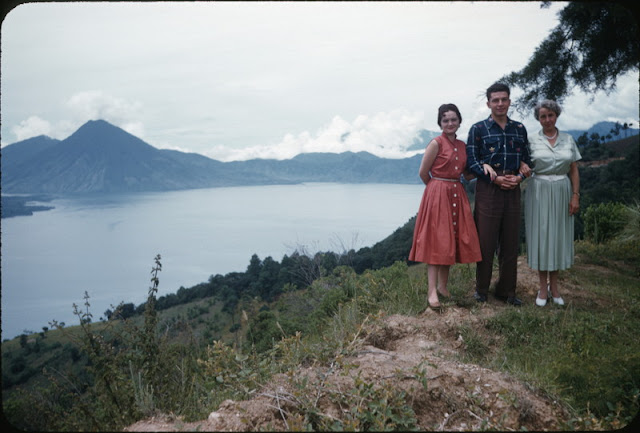 I kept seeing this one young couple in the slides, along with their three small children. My mom said that this was Dr. Carlos & Lilly Perez, who became dear friends with Malcolm & Thelma back when Dr. Perez was doing residency in California, and also when Malcolm visited Guatemala regularly with INCAP (Instituto de Nutrición de Centro América y Panamá). Lilly is in the picture above. Here is a picture of Lilly & Carlos with Thelma in 1955 at Lake Atitlan, which is a beautiful lake in the highlands of Guatemala, surrounded by volcanoes: