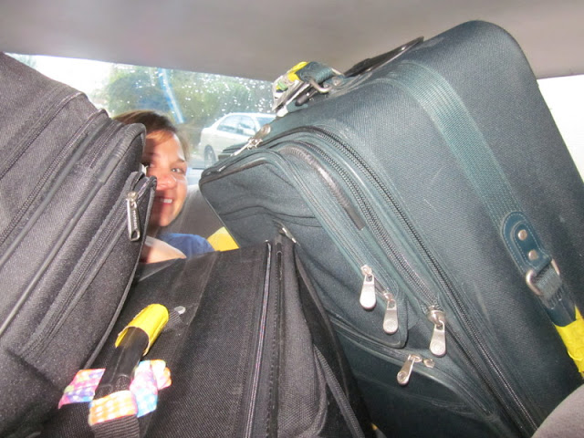 Wednesday morning, December 7, 2011, we arrived in Guatemala City at 5:30 a.m., and we piled all four of us with our 5 suitcases into a tiny taxi. Here's a picture of Linette in the back seat.