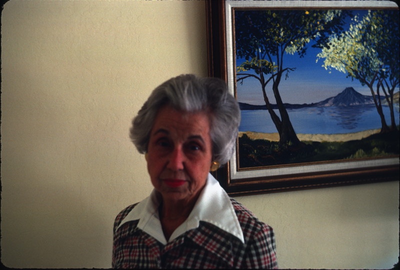 Thelma and my dad (Robert) had a bet at one point of who could get around to painting an oil painting first. Robert eventually won, but Thelma took some painting classes at Rossmoor, and went on to do a painting of Lake Atitlan that now hangs on my bedroom wall. Here is a picture of Thelma with the painting she made. She said she based it on a postcard that she had seen, but that she moved the trees over to give it better composition.