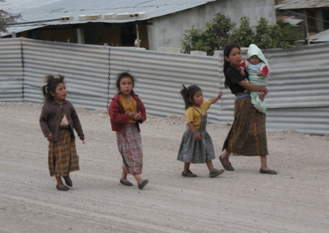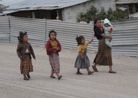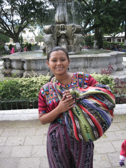 During the entire trip, I was amazed by the colorful patterns woven into these hand-made clothes. Each village has a distinctive pattern, and Guatemalans can tell where someone is from by looking at their clothes. The skirt is called a corte (COHR-teh) and the blouse is called a huipil (WEE-peel). They also use their "shawls" for all sorts of things, including carrying babies on their backs, carrying goods on their heads, warmth, or for adornment. In the picture above, for example, you probably wouldn't guess that the gal has a hundred or so necklaces draped on her arm, hidden by her blanket.