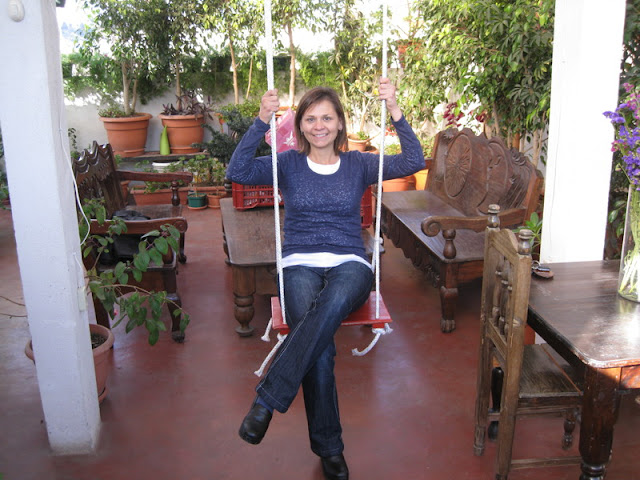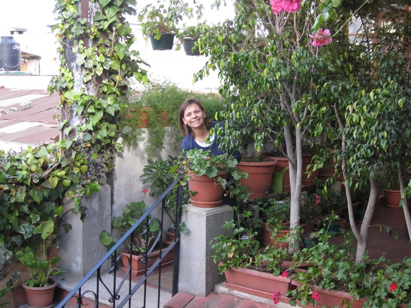 We checked into our charming bed & breakfast (La Casa San Bartolomé), which was hidden behind a nondescript doorway in a normal alley-like street, but which was beautifully adorned inside with plants everywhere. Here is Linette in the courtyard.