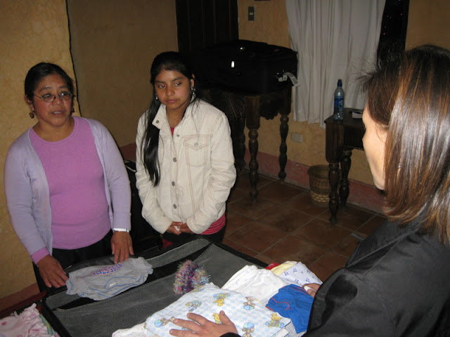 Here is Yamilet, her daughter Kimberly and Linette, talking about the baby blankets. (You can even see one of the cute hats).