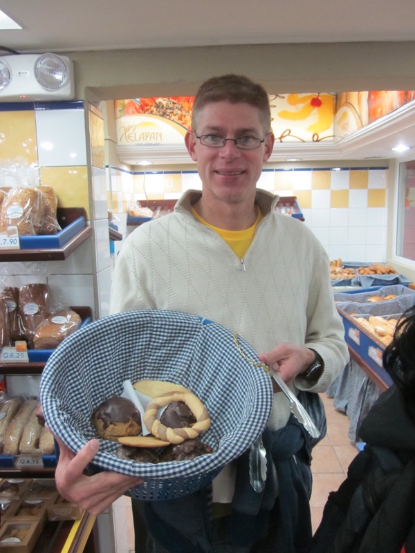 Next we checked out the central square, where we ate lunch, hit the ATM and then bought "pan" (baked goods, like pastries and cookies). Neal Summers was especially excited about the bakery, "Xelapan", having fond memories of eating there as a missionary. Here is Neal with his "shopping cart" full of goodies.