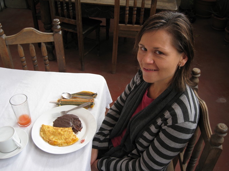 Each morning a nice lady would make us breakfast to order, which was included in the $40/night we were paying. We usually got black beans, some sort of eggs, a glass full of random blended fruit, and a couple times we talked them into giving us hot chocolate instead of coffee. (After the first time, we bought our own for them to make for us). Their hot chocolate is made by melting a big block of chocolate in water, and it was really good to dip the cookies in that we bought at Xelapan.