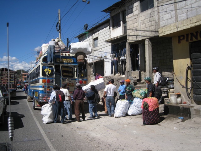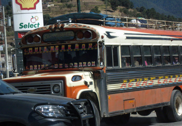 Below is a picture of a "chicken bus". These are decommissioned American school buses that have been sold to Guatemala and fixed up and "pimped out". They are the most popular mode of transportation for most of the people, especially the poor people. You can put anything on these things, including chickens, big bundles for market, and an unlimited number of people. One of my goals for the trip was to ride a chicken bus at least once. (See an upcoming episode for more on that).