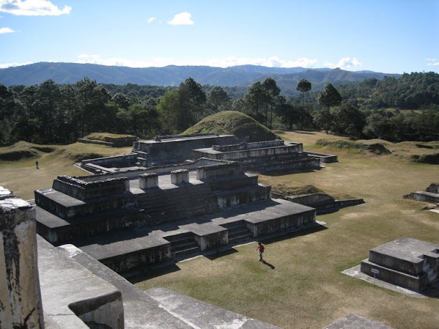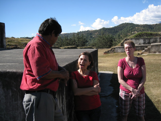 When we reached the town of Huehuetenango, we got gas (and ice cream bars) and asked for directions. A customer at the gas station said he lived right by the ruins and would show us the way. Linette and Stephanie talked with him for a while, and found that he had relatives who were LDS (even a nephew on a mission). He didn't have a Book of Mormon, so Stephanie ran back to the car and got him one. Then we followed him and his family to their driveway, where he showed us that the ruins were just down the street. I was proud of our "sister missionaries".