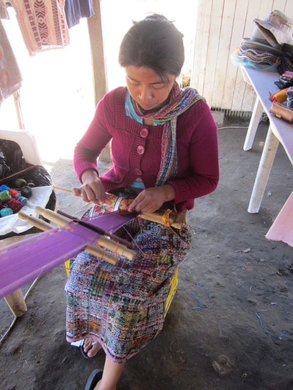 While there, we saw a gal doing some hand weaving. As is typical, you can see that she has tied one end to something, and has the other end around her waist. She can then put tension by leaning back a little while she waves.