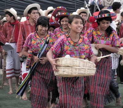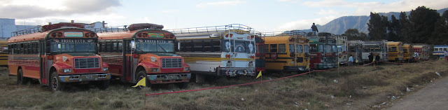 So Saturday afternoon, December 10, 2011, after a brief mission reunion, we drove to the outdoor venue for the celebration. When we pulled up, we saw a huge row of "chicken busses" that had brought 2500 youth from the 11 stakes around Guatemala that would be in the new temple district.