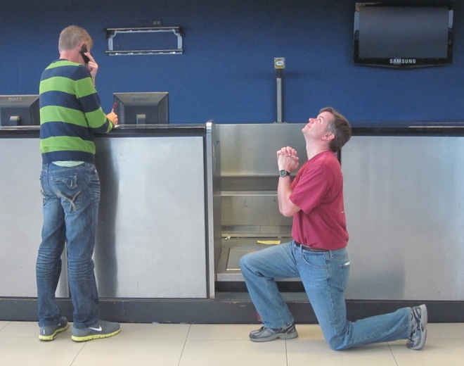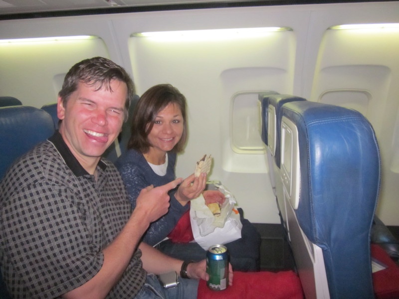 And sure enough, when we got to the Delta counter, there was nobody there, and we were hosed. We just stood there for a second trying to figure out what that meant for us. Then we scrambled to talk to everyone we could get in touch with and, no, there was no way we were getting on the plane. One lady said that since we had flown with frequent flier miles, we would have to basically come once a day until there was room on a flight for us (!).