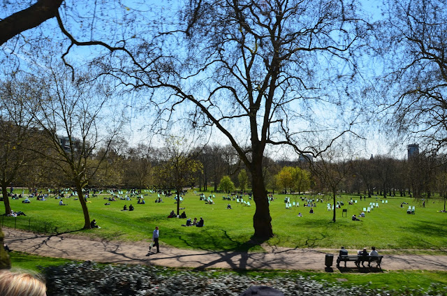 Here is "Green Park", so called because it doesn't really have flowers, ponds, or much of anything else. The story goes that Queen Catherine discovered that her husband, King Charles II, had picked flowers there for another woman, so she ordered that all flowers in the park be pulled and no more planted.