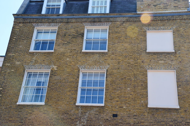 Around 1700, England introduced a "window tax" designed to tax wealthy people, judged by how many windows they had in their house. So many people filled in some of their windows to avoid the tax. By the time the tax was repealed in 1850, many houses had already built walls and decorated or arranged the interior such that they didn't bother replacing the windows. So to this day, you still see filled-in windows like this around town.