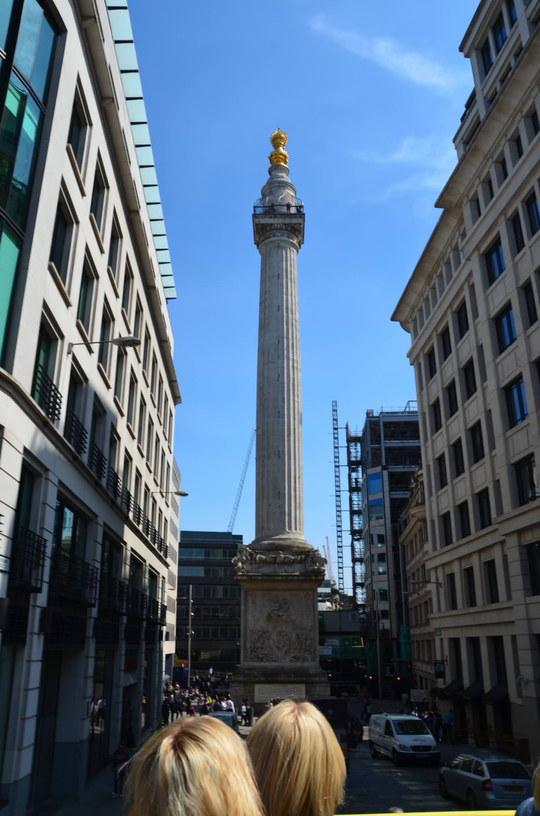 This is the monument to the Great Fire of London, which took place in 1666. It is 202 feet (62m) tall, and is built 202 feet from where the fire started. The fire gutted the medieval city of London inside the old Roman city wall, and destroyed the homes of 70,000 of the city's 80,000 inhabitants.