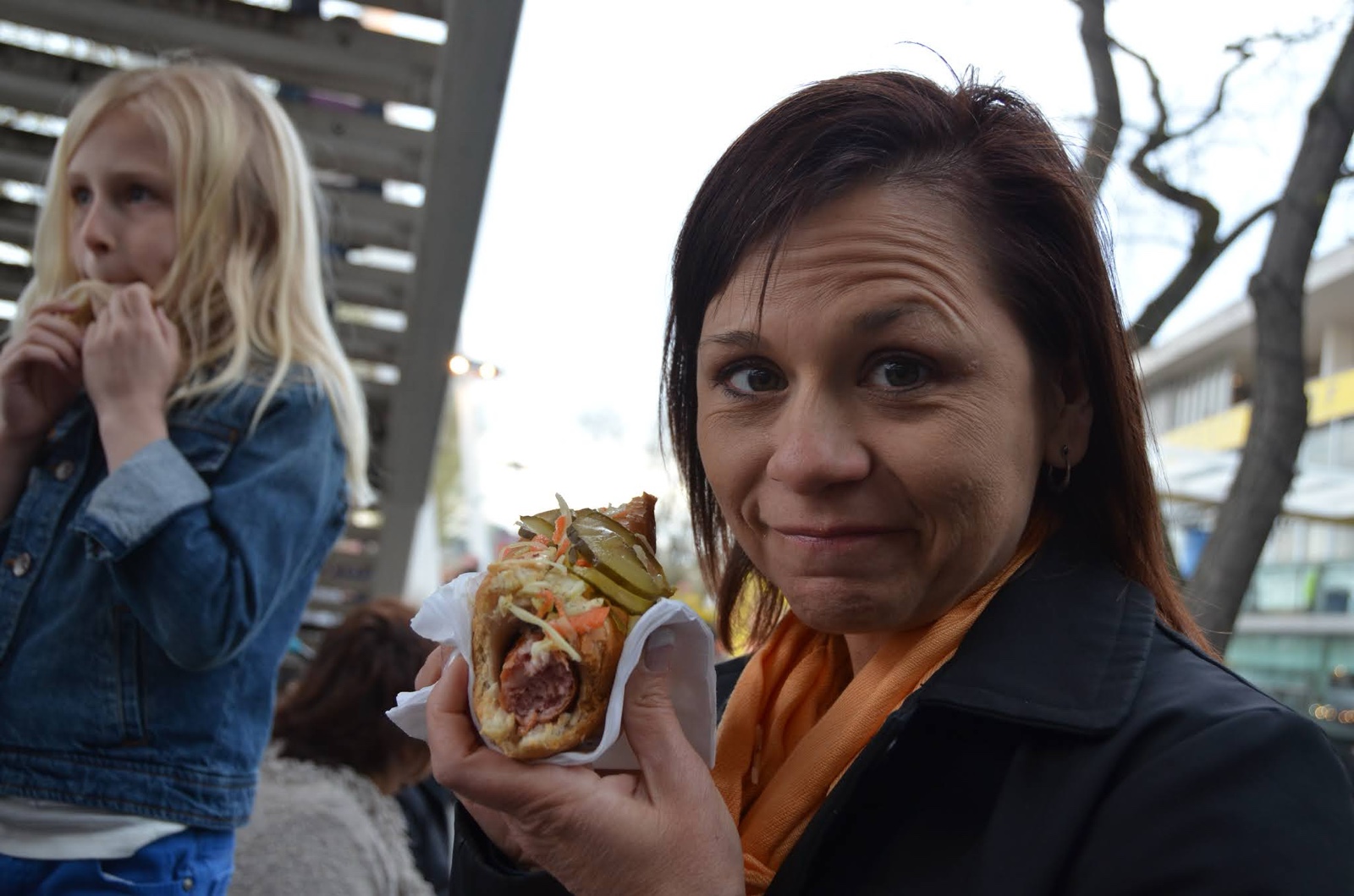 Linette got some bratwurst at the very first booth. Others of us got Moroccan food (grilled meat wrapped in a flat bread), and Dan got some tasty things to share (meat with cinnamon wrapped in something like a tortilla).