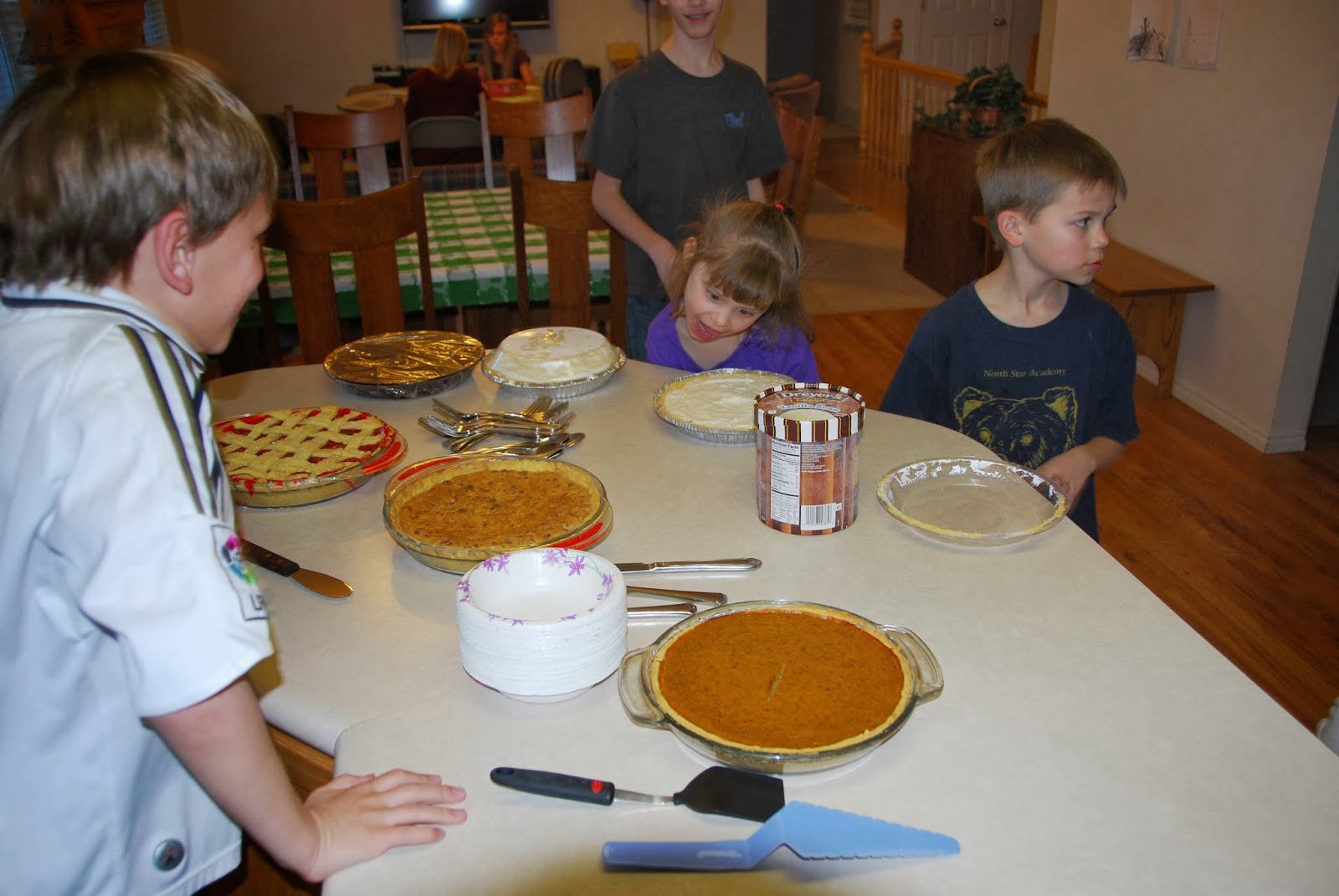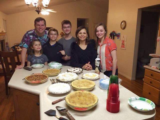 Here is a picture of our family celebrating Pi Day. There are 8 pies shown here, with one more arriving shortly (and this doesn't count the chicken pot pie that they had for dinner).