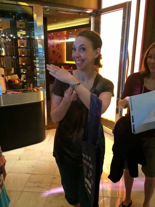On Day 2 (April 7, 2014), we went to a painful shopping event, but Melissa Elmes won one of the two main prizes: a bracelet made with aqua Caribbean stones.