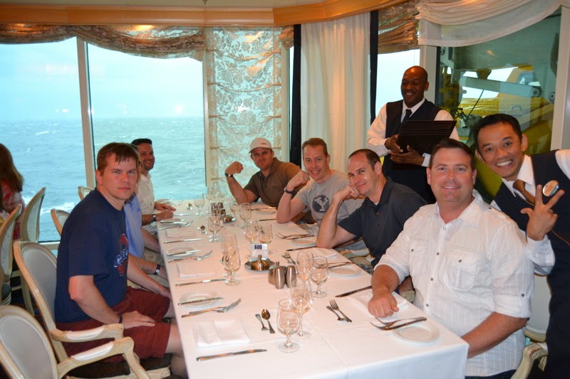 Here you can see both Carl (left) and Richard (right), our waiters for the week. We told them that we were all in trouble and got banished to the other table.