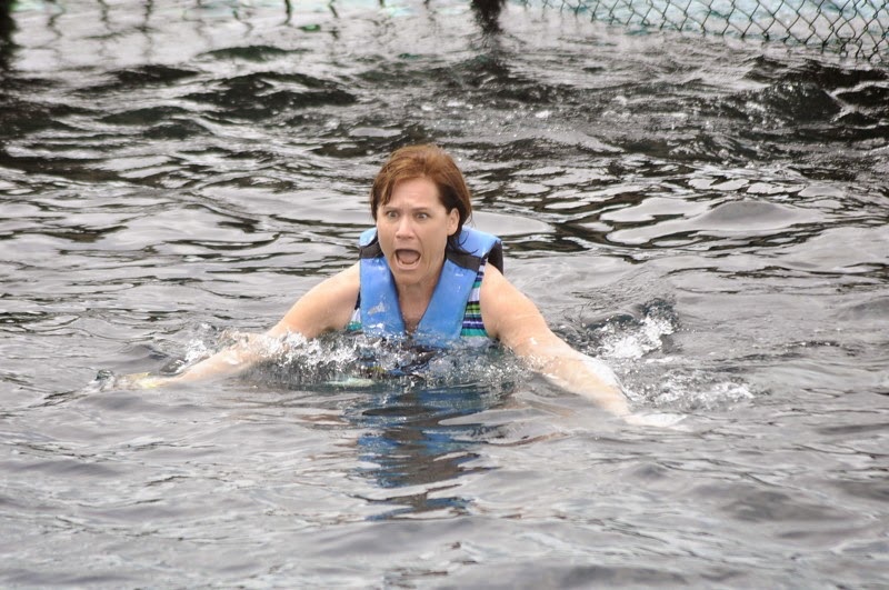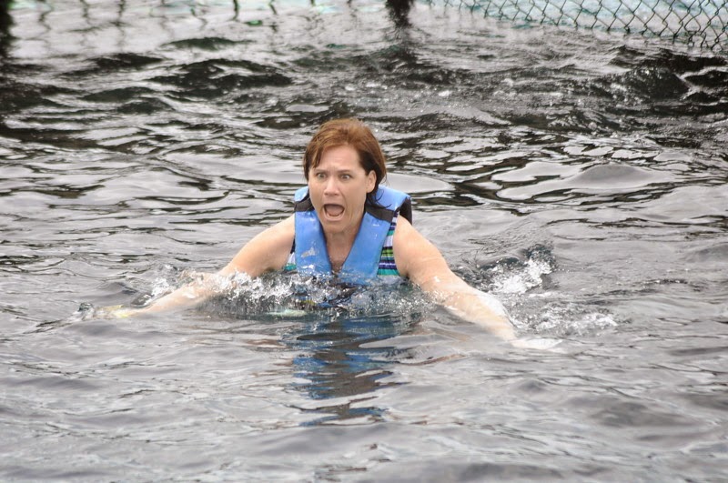 Here is Melissa Lym grabbing two dorsal fins and getting pulled for a ride, too!