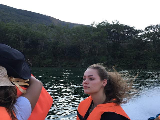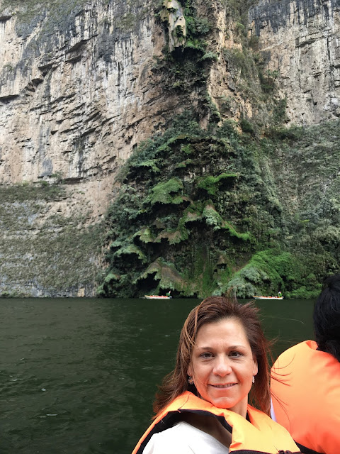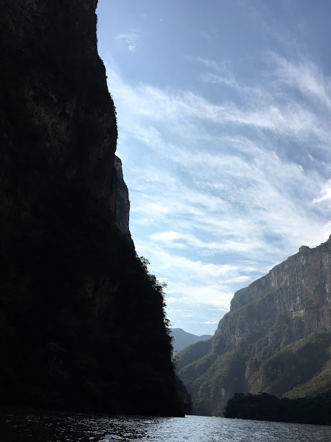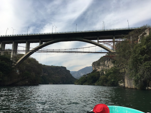 Soon we found ourselves on a boat heading up the Cañon de Sumidero. (They had to have a bigger passenger switch places with a smaller one so the boat wouldn't lean). Here is the bridge across the mouth of the canyon. (And remnants of the old one that sort of fell apart.)