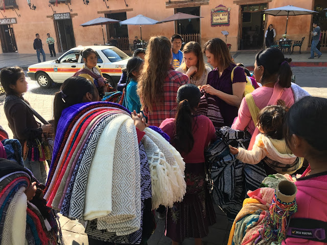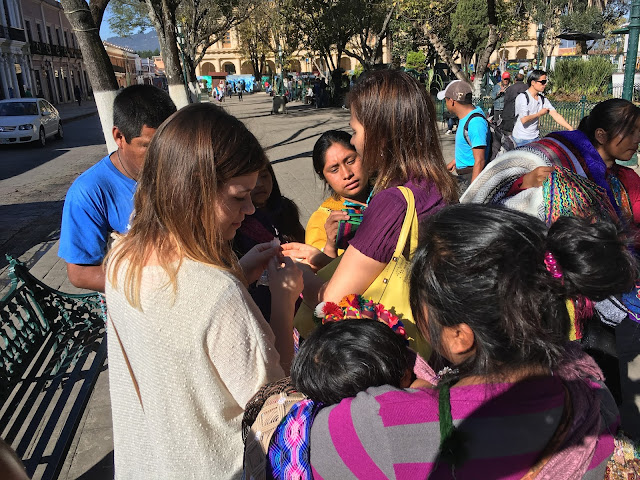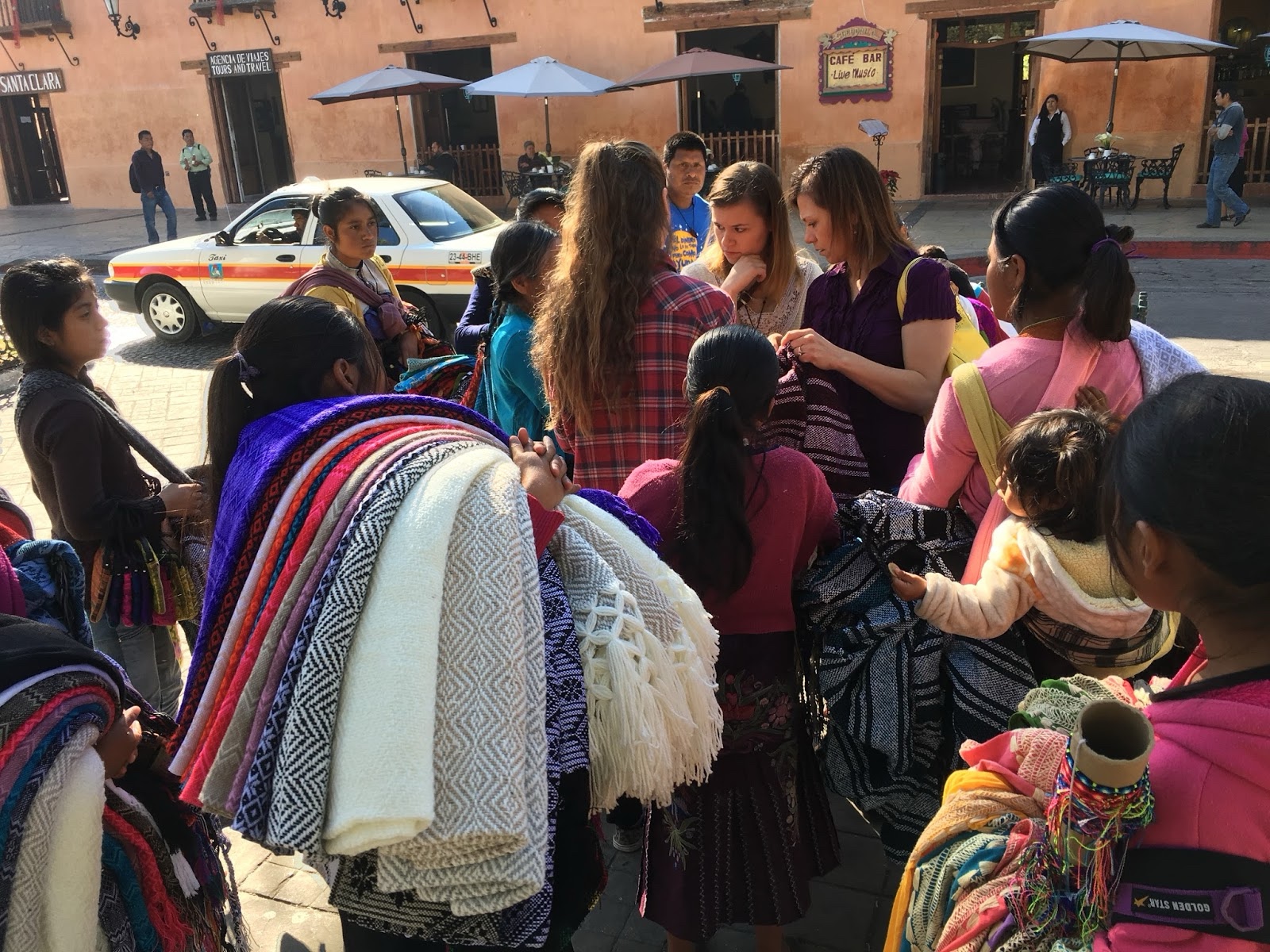 Soon there was an entire mob offering their wares. I love this picture: Kelsi's sidewards glance; the baby on the back; and the purple and other colors on the lady's shoulder. Linette ended up buying the hoodie she's holding.