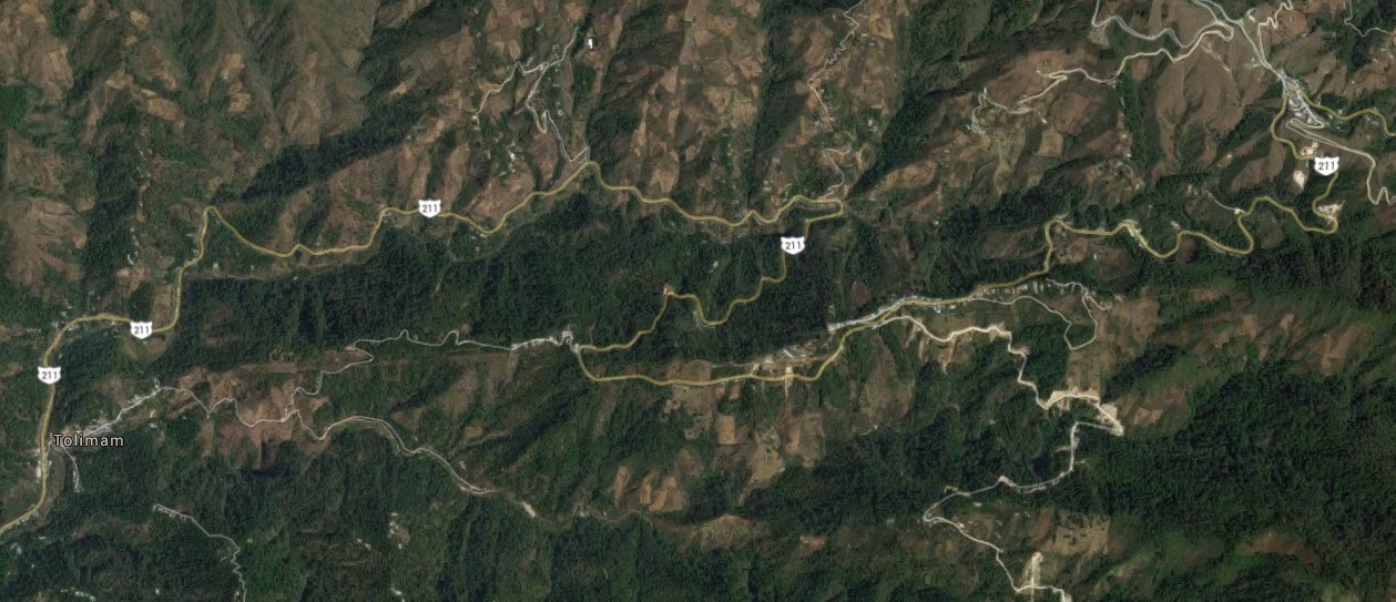 At that point, it was time to drive from Comitán to Tapachula on the road from Hades. Holy cow, it wound back and forth and back and forth and hither and yon and around and around. Here is a satellite picture of one small segment of it.