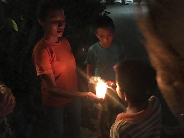 We also lit off a few small fireworks, even though it wasn't quite 10pm yet. Their mom didn't let them go out at midnight due to the number of people who shoot off real guns that can hurt or kill people on occasion when the bullets come back down.