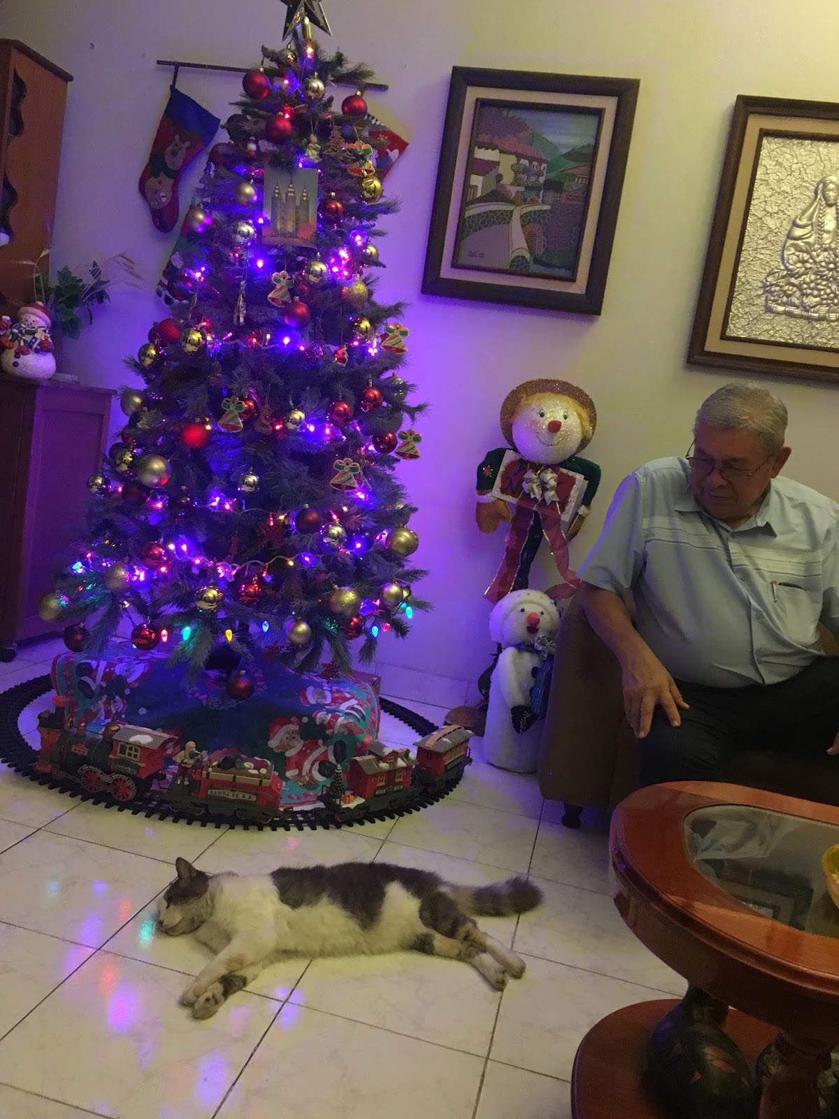 Finally, we went to spend New Year's Eve with the bishop and his family. They still had their Christmas tree up. Their cat seemed to have it pretty good.