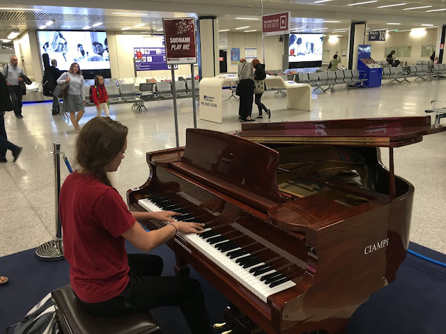 There was a grand piano in the airport that said, "Play me", so Erika sat down and played a little ditty, and people clapped.