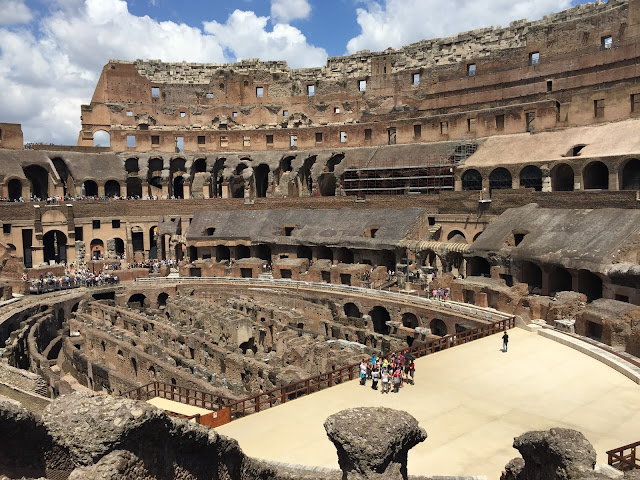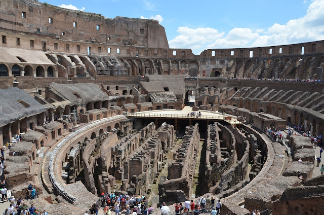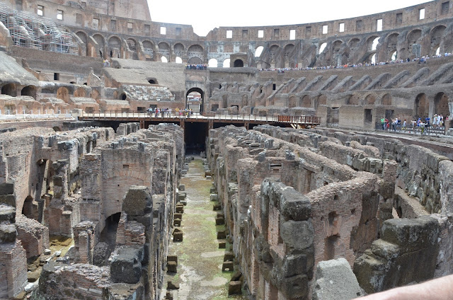 Under that floor were two stories of rooms that were where the gladiators would go, and where animals were kept. There were a series of trap doors and elevators on pulleys, so a door would open, up would come a gladiator or a lion, and then it would go back down and close.