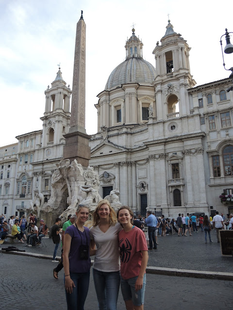 | Mikayla, Shaylee and Erika. Piazza Navona. Fountain of the 4 Rivers (statue with Egyptian obelisk), in front of Sant'Agnese in Agone (the cathedral). |