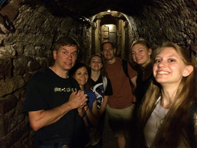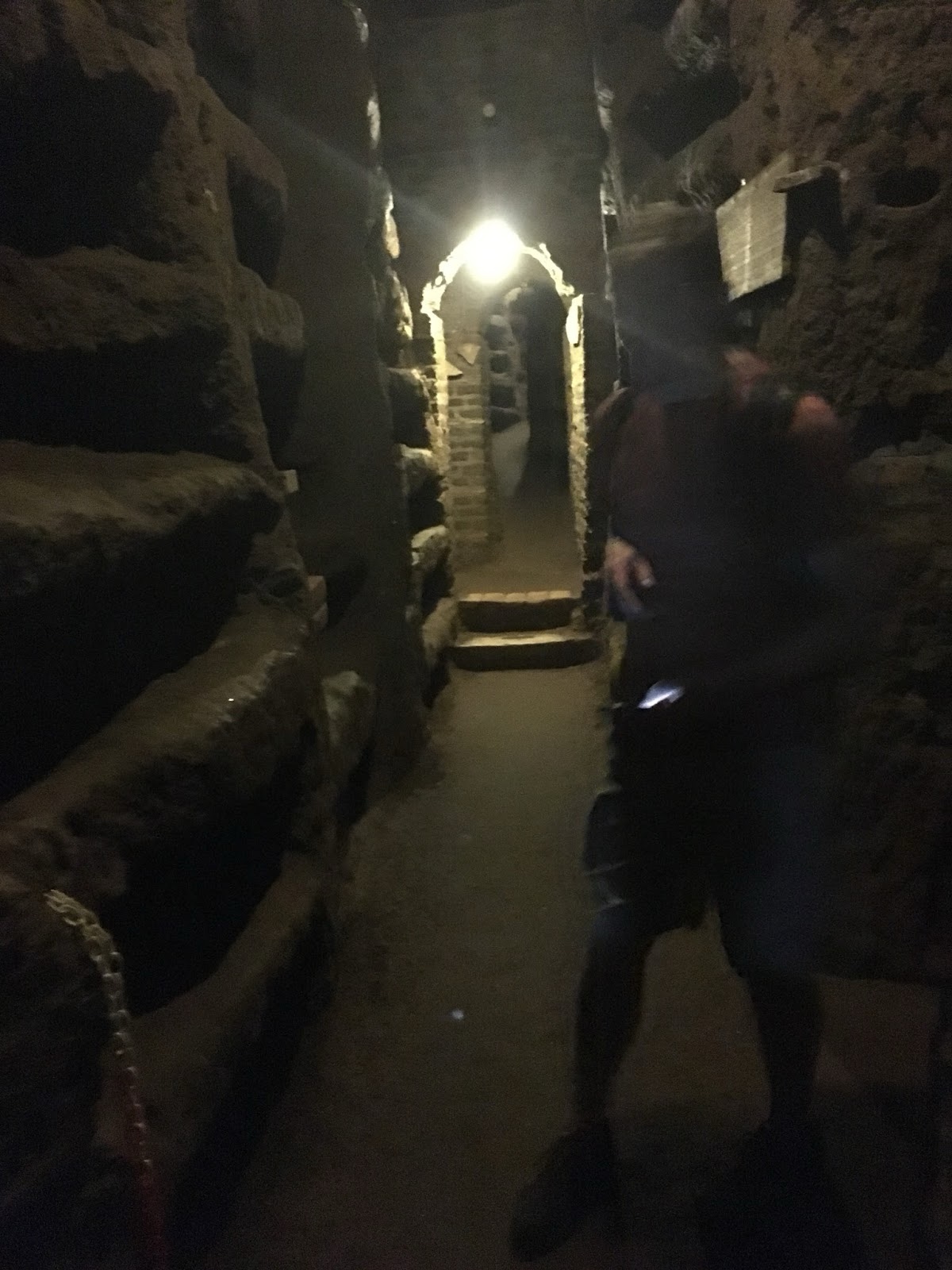 The tunnels and chambers were dug out of relatively soft volcanic rock. The pick marks are still visible all over the ceilings. The burial chambers were empty because apparently tourists kept sneaking bones as souvenirs, so the bones were moved. However, at one point part of our group was asked to walk down a dark chamber to make room for the others to see something, and I turned on my cell phone flashlight, and saw a pile of small femurs and a piece of a skull, along with a painting of a boat on the ceiling.