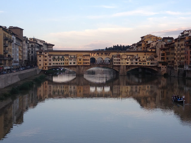 Next we walked over to Ponte Vecchio (the "Old Bridge"; ponte=bridge, vecchio=old), where there are shops all along the ground floor, and a passageway along the top that allowed the Medici family to walk between the government buildings on one side over to the Pitti Palace on the other side, without getting assassinated and stuff.