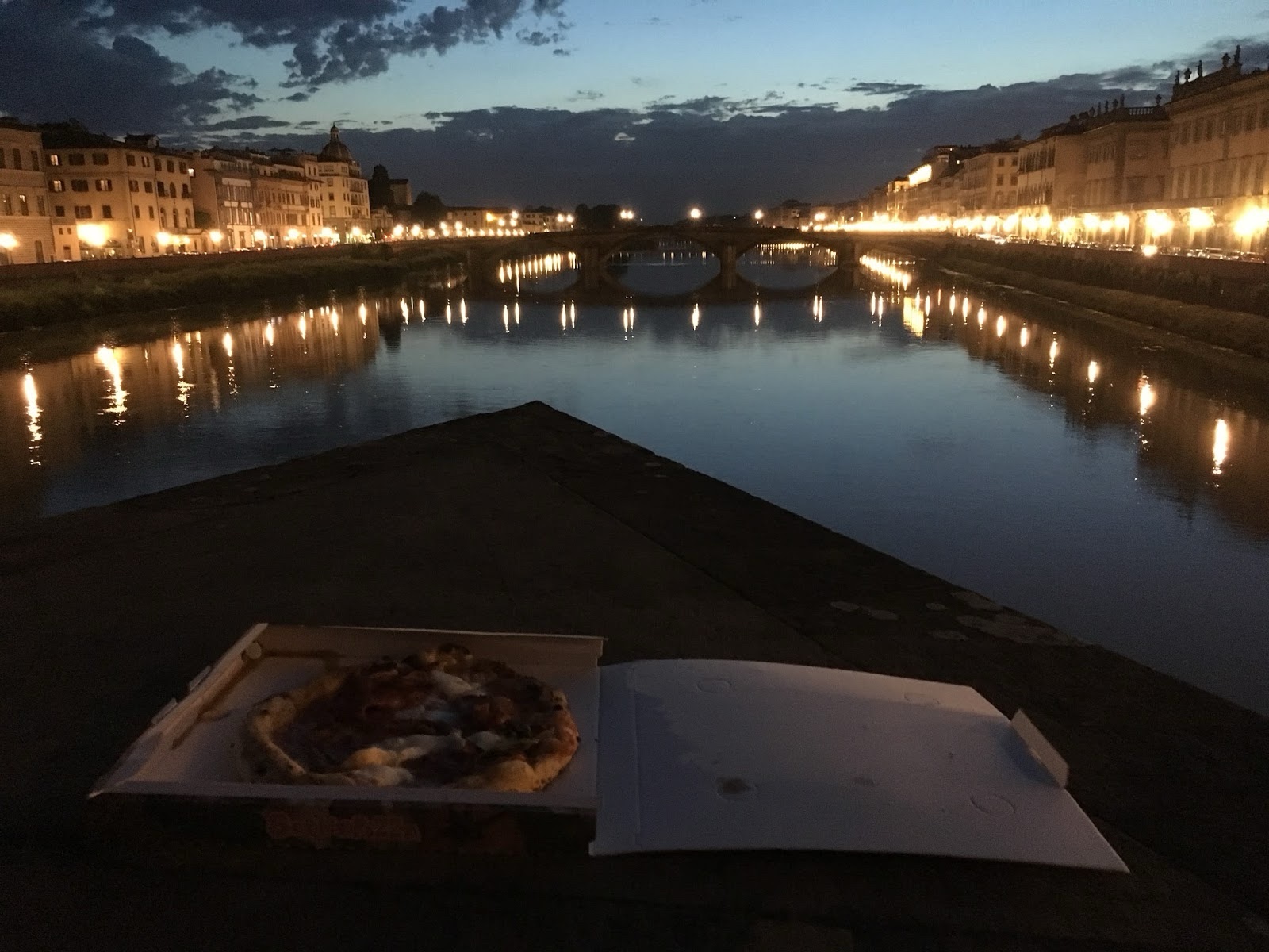 So we ordered pizza, and took it back over to eat on the bridge while we watched the sun go down and the lights come on.