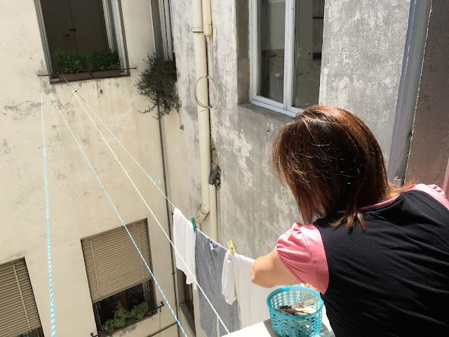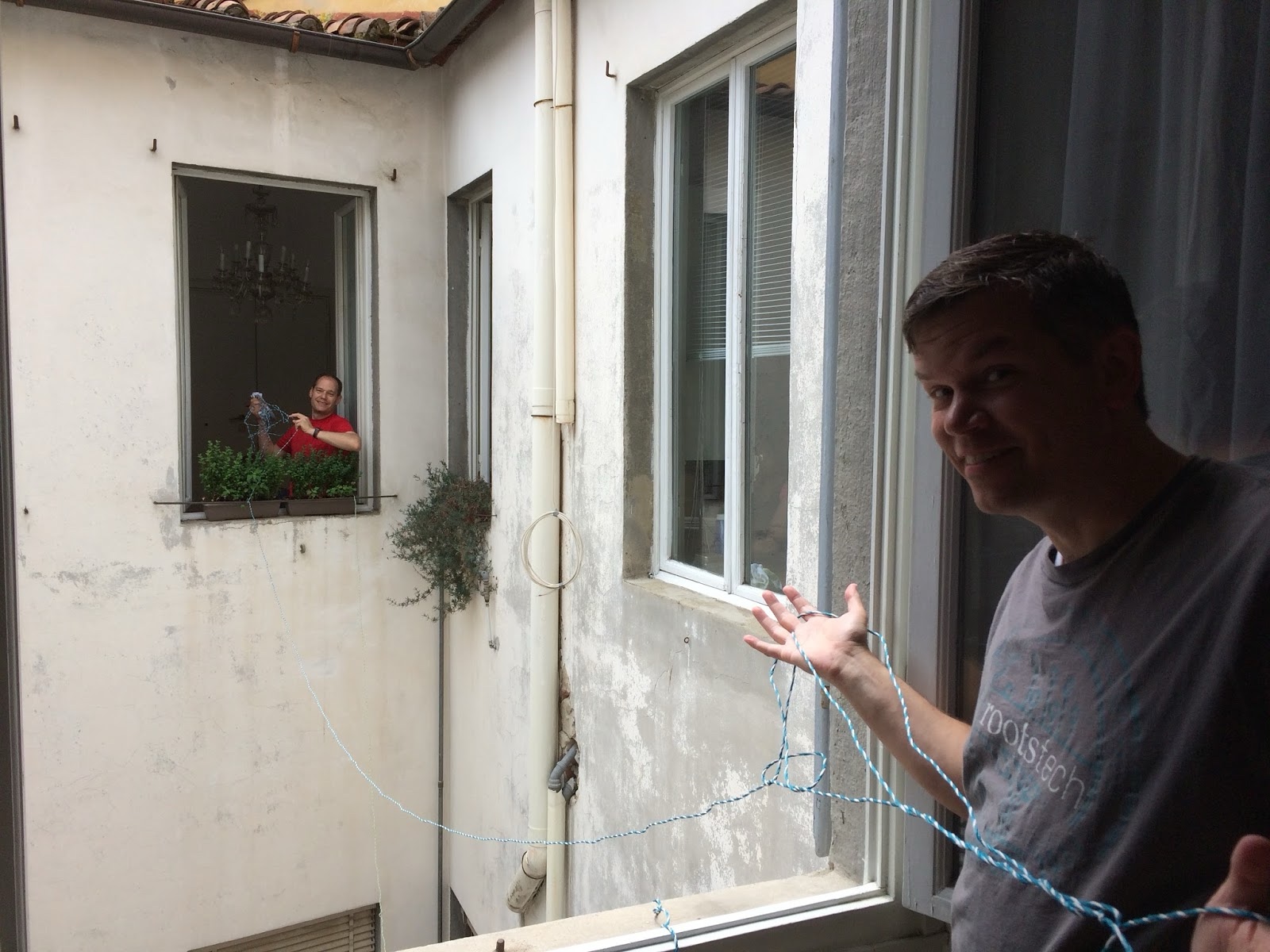 Then Roger and I tied our laundry string to a wet sock and threw it across the inner courtyard a couple times to rig a laundry line.