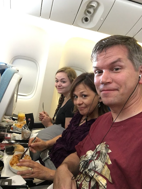 Once again, we found that what my cousin Robin had reported to me was true: Turkish airlines had very nice food, and an onboard chef with a chef hat who mingled with the passengers. I was adventurous and tried the yogurt-based Turkish drink, found that I couldn't handle the saltiness, and tried the lemonade with mint instead.