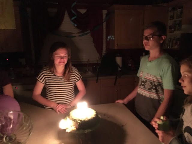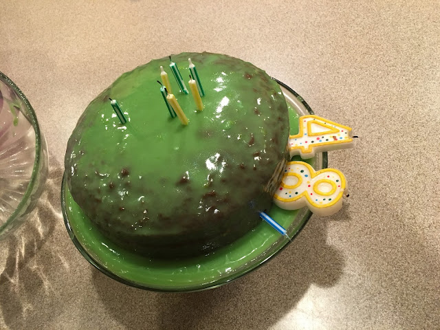 And then there was this double-purpose green slime birthday cake with Jared's candles on top and mine sticking out the side. What clever kids!