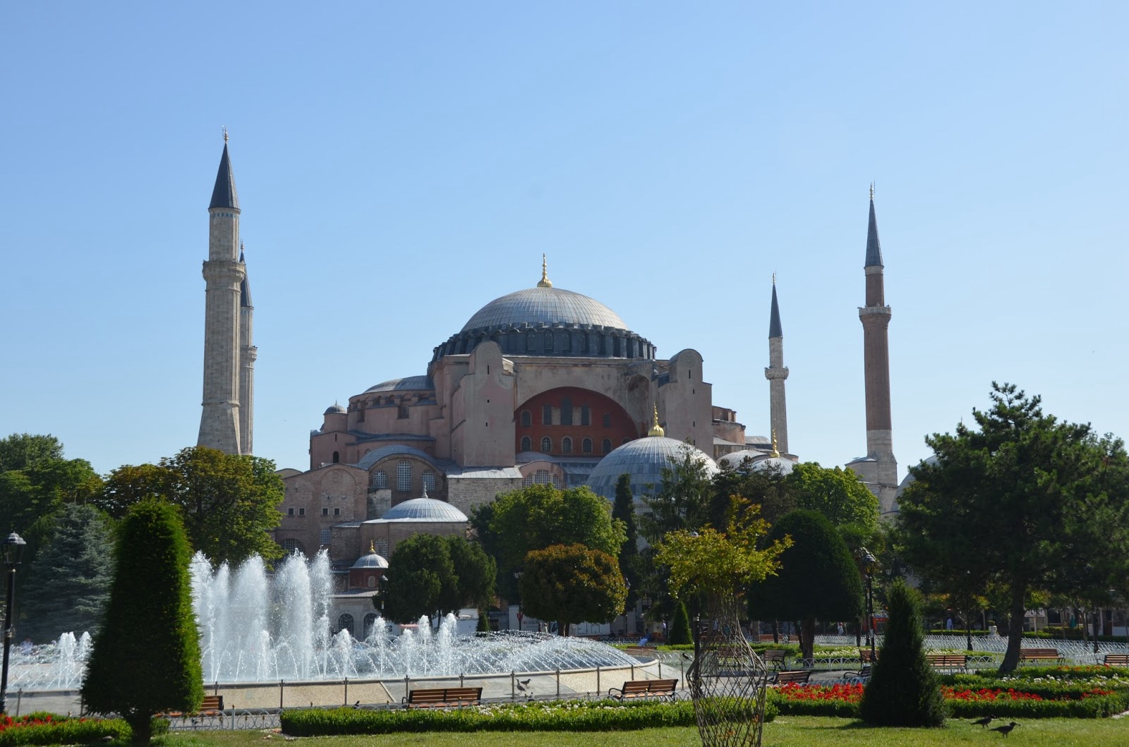 Just across from the Blue Mosque is Hagia Sophia (Latin for "Holy Wisdom"), which was originally a Greek Orthodox Christian basilica (church), constructed in 537 A.D. It served as the seat of the Patriarch of Constantinople until 1453, when it was converted to a mosque (at the same time as the city became Istanbul). In 1935, it was secularized and converted into a museum.