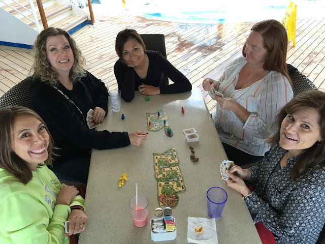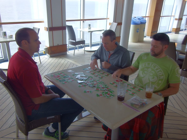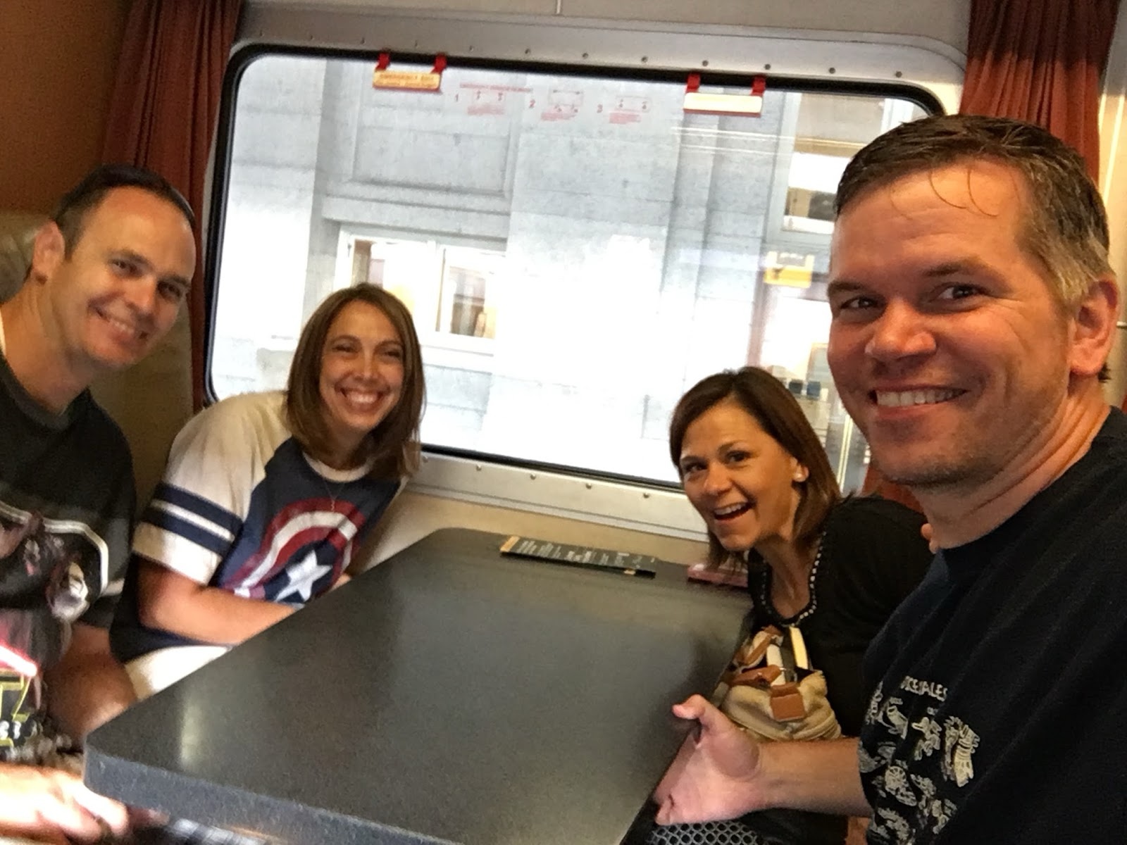 The next morning, Layne and Denise drove us to the Amtrak station, and told us to be sure to get seats on the left-hand side, so we would have a nice view. Melissa asked the ticket guy for that, and he said he'd take care of us. Sure enough, while everyone else had forward-facing seats, we were at a table where we could get the board games going before we even got on the ship!
