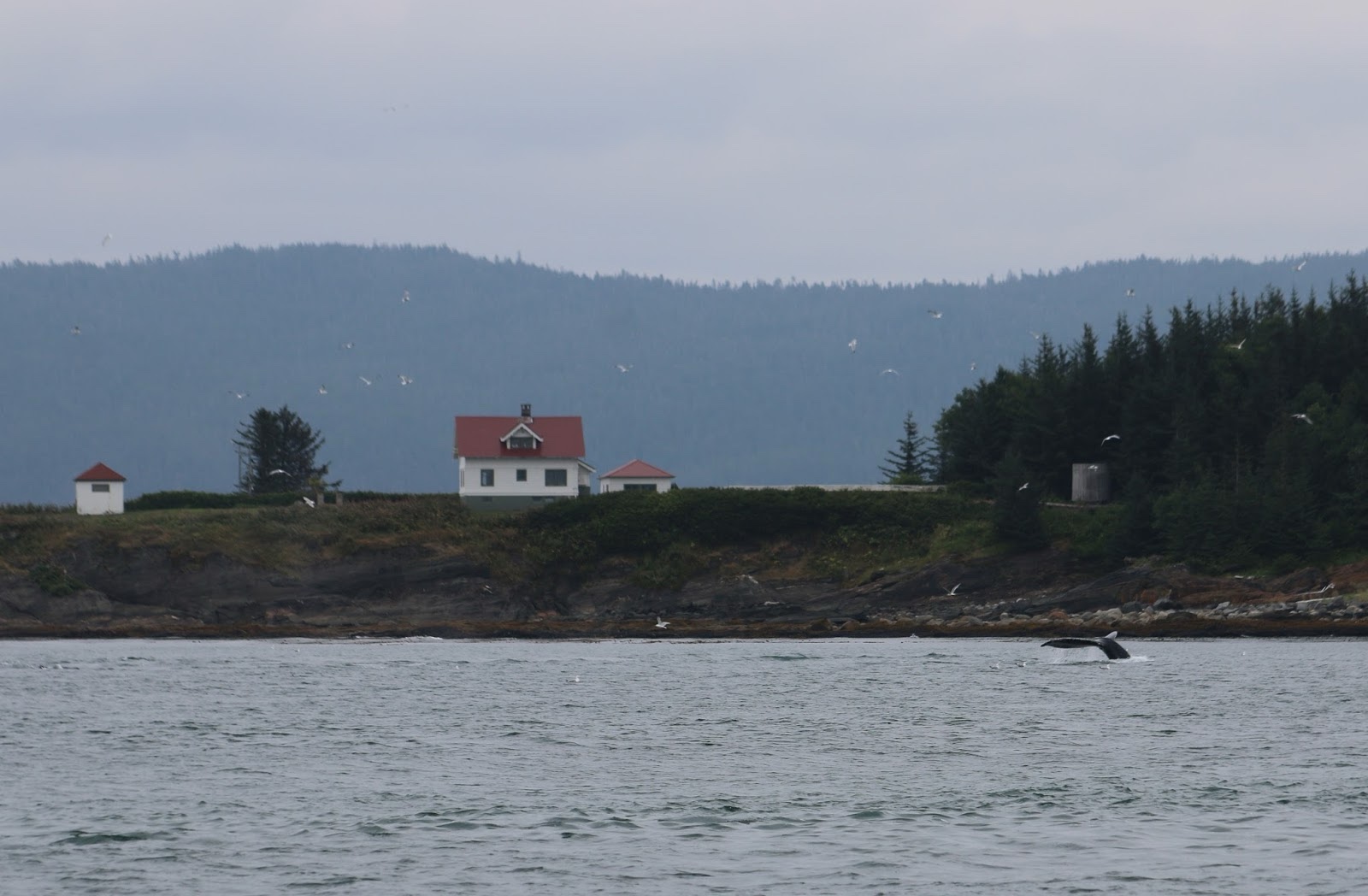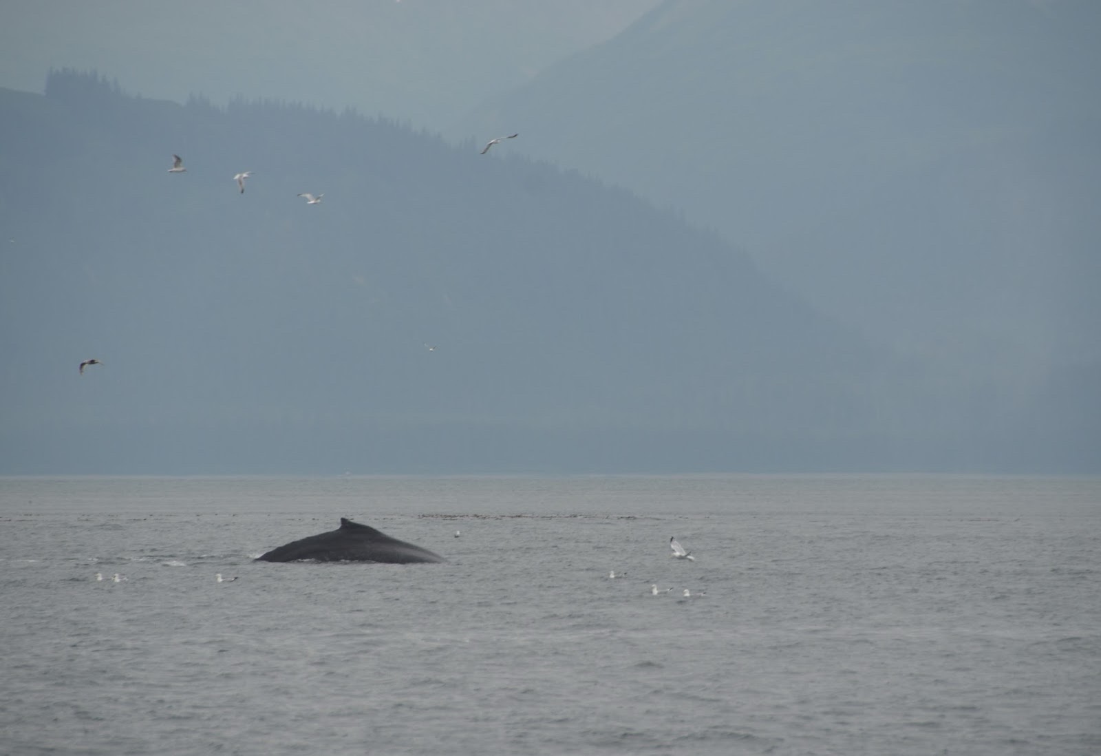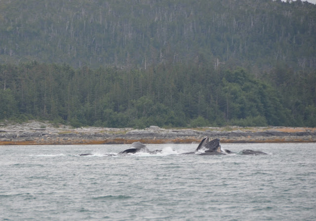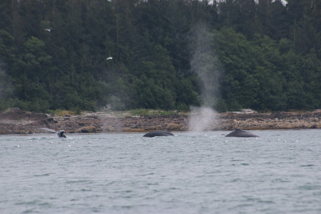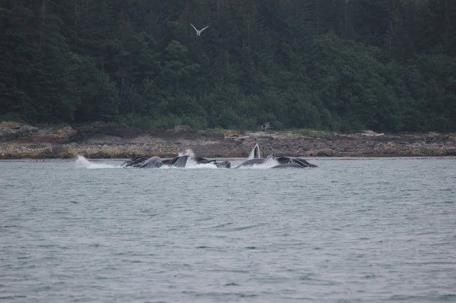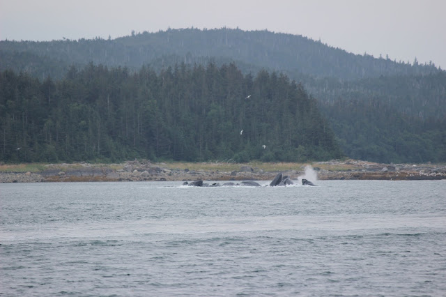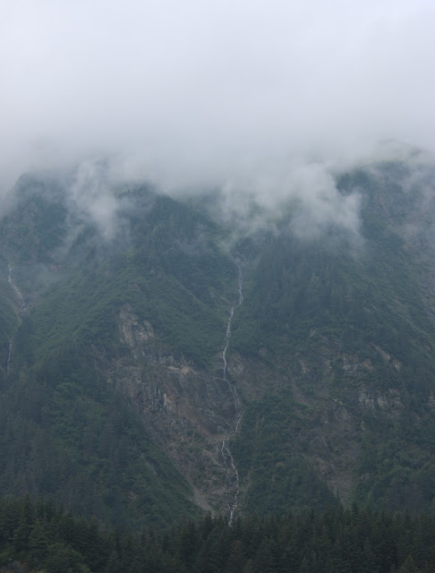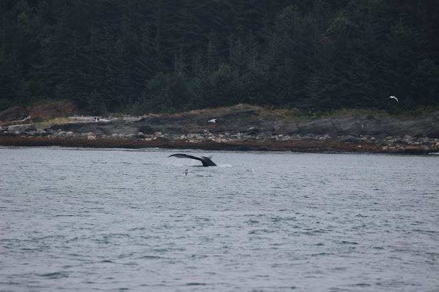 Our whole group took a bus (which we almost missed) to go whale watching with juneautours.com. Along the way, we saw the Mendenhall Glacier in the distance as we crossed a bridge. It was cool seeing it loom above the town like that.