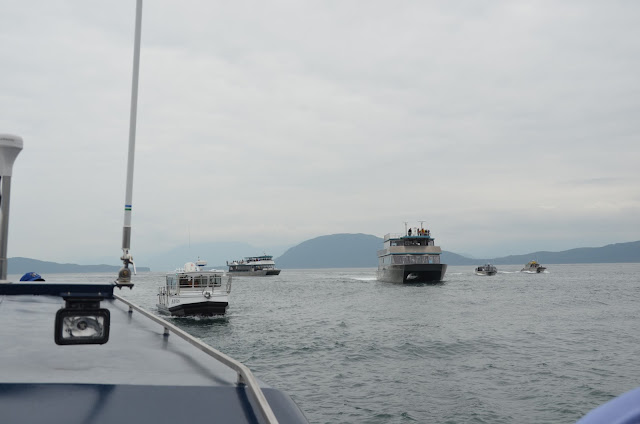 Here are a couple of attempts at video. Our little boat rocked enough to make it very difficult to video well on high zoom. (You might want to go full screen on the video, and turn down your sound on the second one, since there's a lot of wind noise).