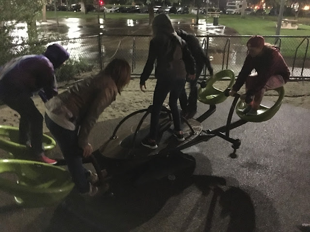 When it got dark, we left the beach and walked back down the street, pausing for a moment on the teeter-totter at the playground.