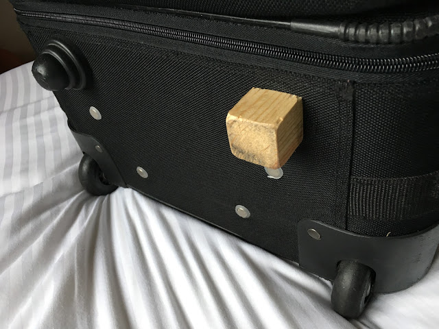 My luggage with missing a foot. So I gave it a "peg leg" just before the trip.