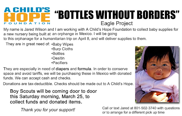 Meanwhile, Jared was needing to do an Eagle project, so a bit of encouragement on Linette's part (seems like there was an understatement hidden in there somewhere), he decided to collect donations of baby supplies (and money to buy supplies in Mexico to avoid border tariffs) for a new nursery they were building at the orphanage.