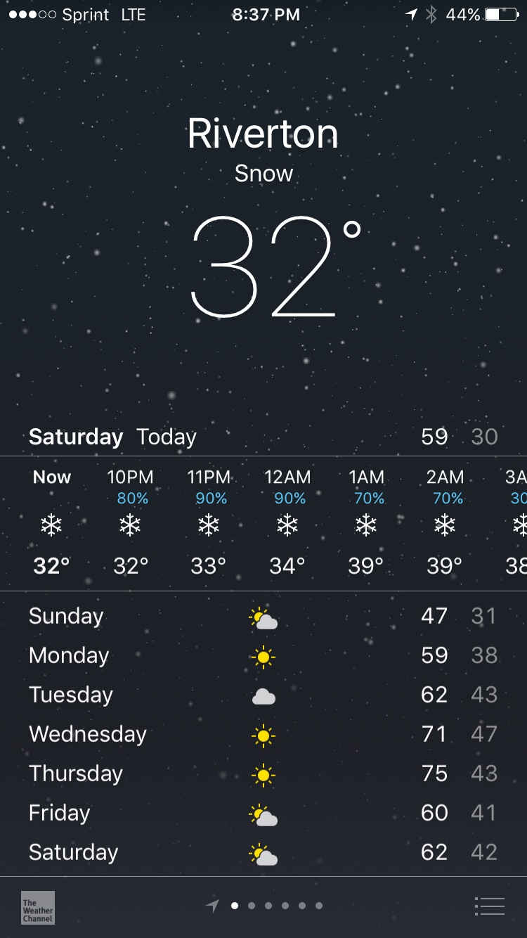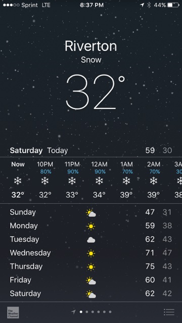 I had to smile when I noticed that it was 32 degrees and snowing in Riverton that day, while the weather was perfect in California.