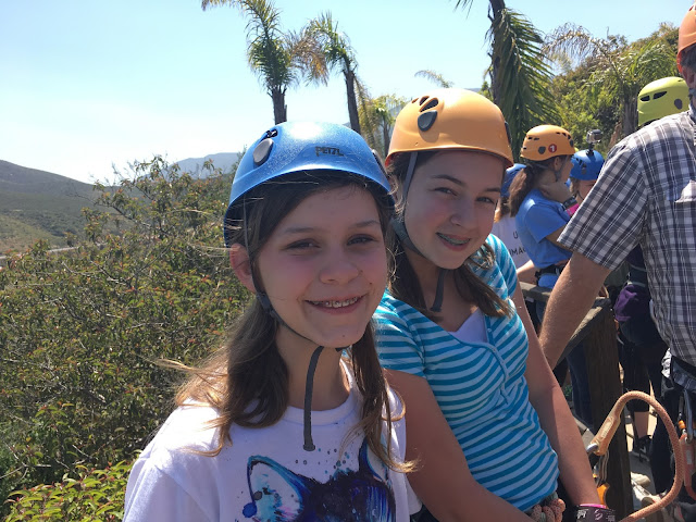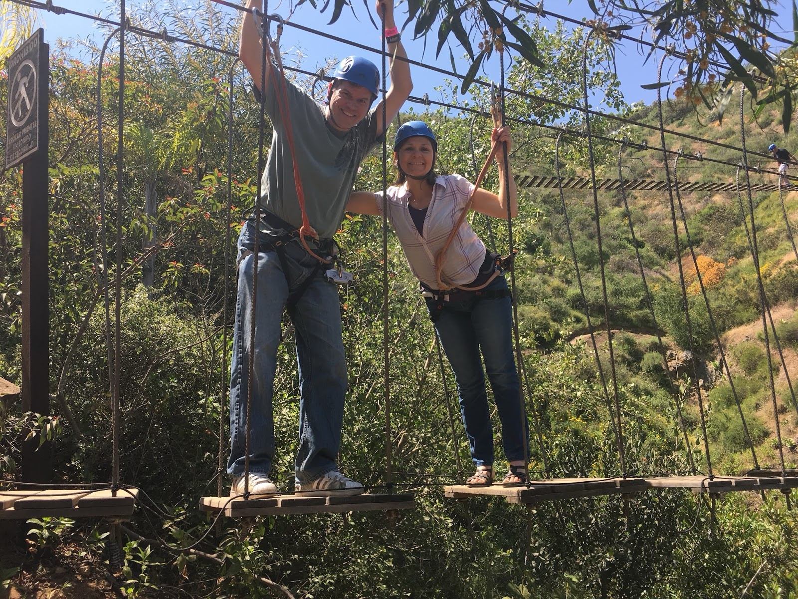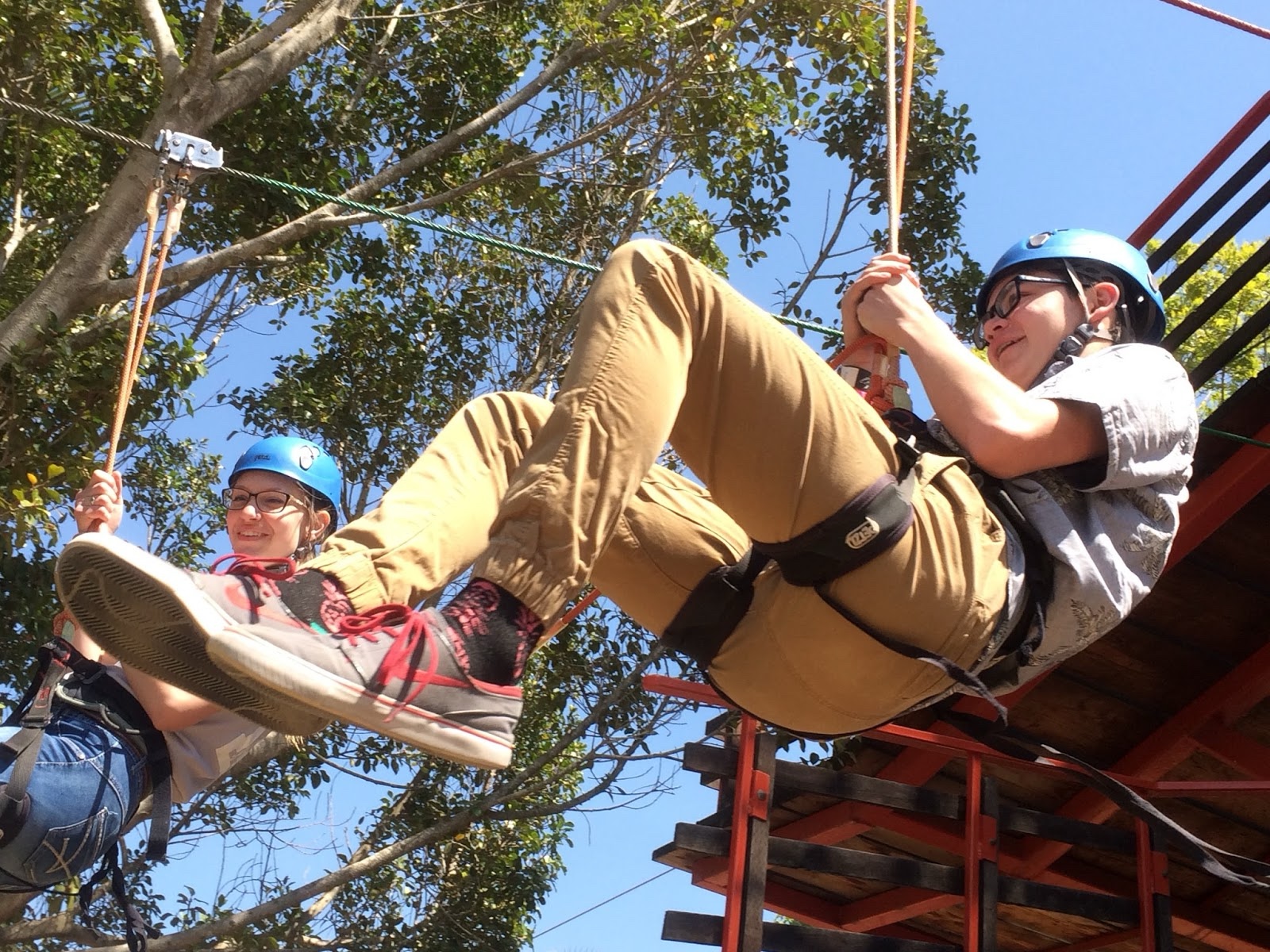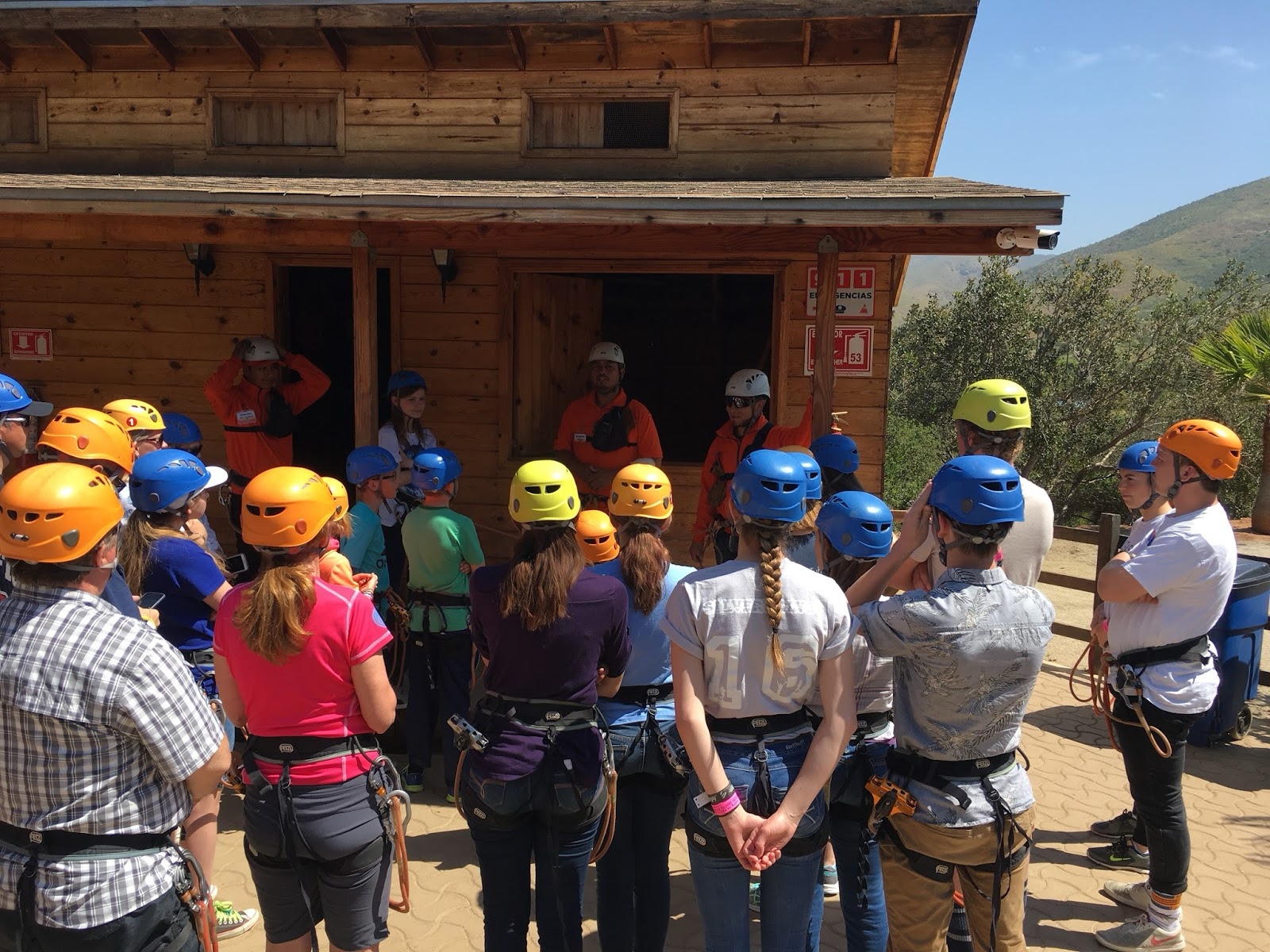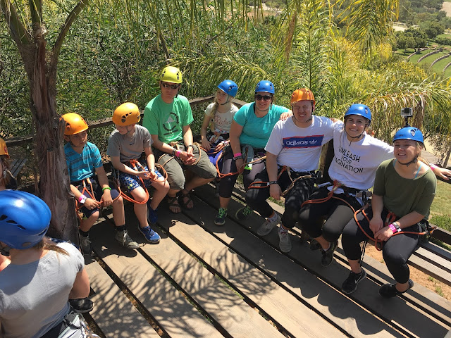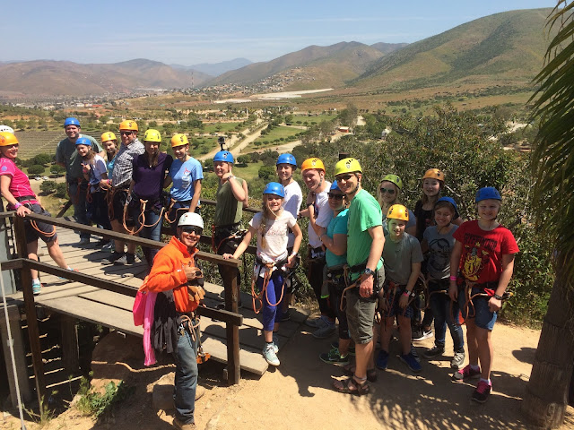 Here a bunch of the group are waiting their turn on the quarter-mile-long zip line(!).