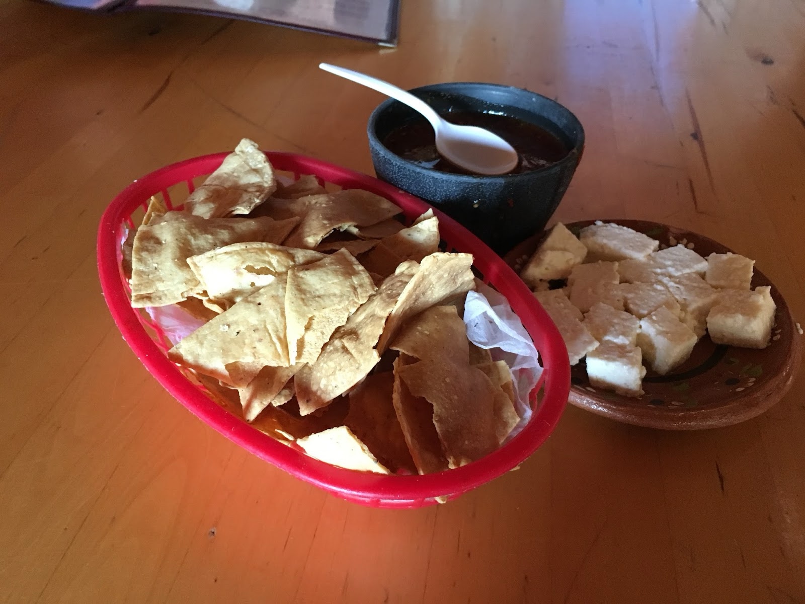 Breakfast included chips, spicy salsa, and a soft, mild cheese.