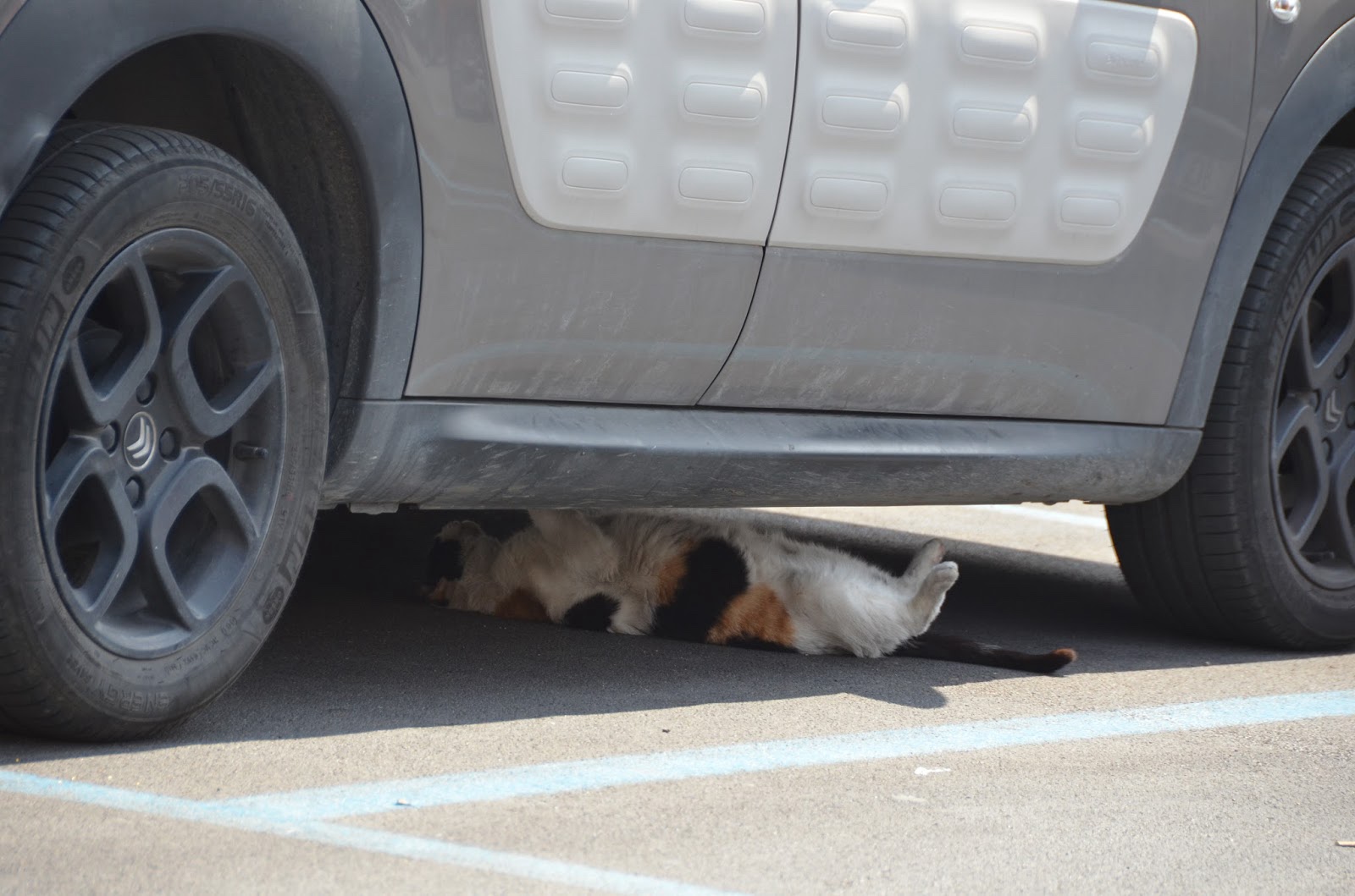 When we were waiting for the bus back to Civitavecchia, I saw this cat in the parking lot. It appears to be changing the oil.