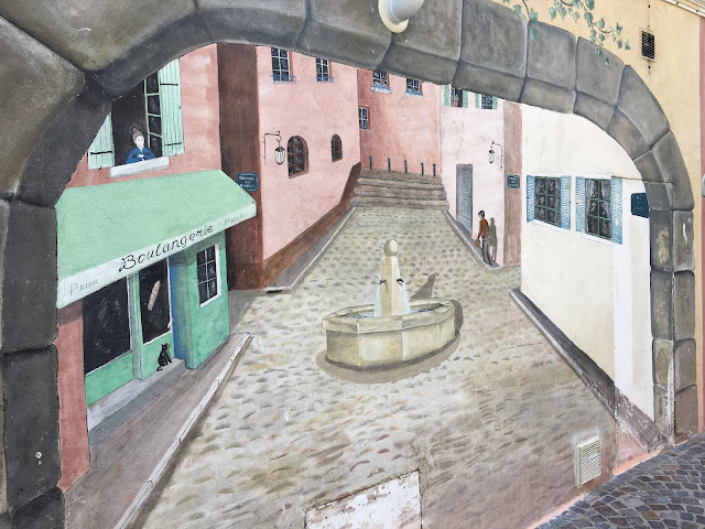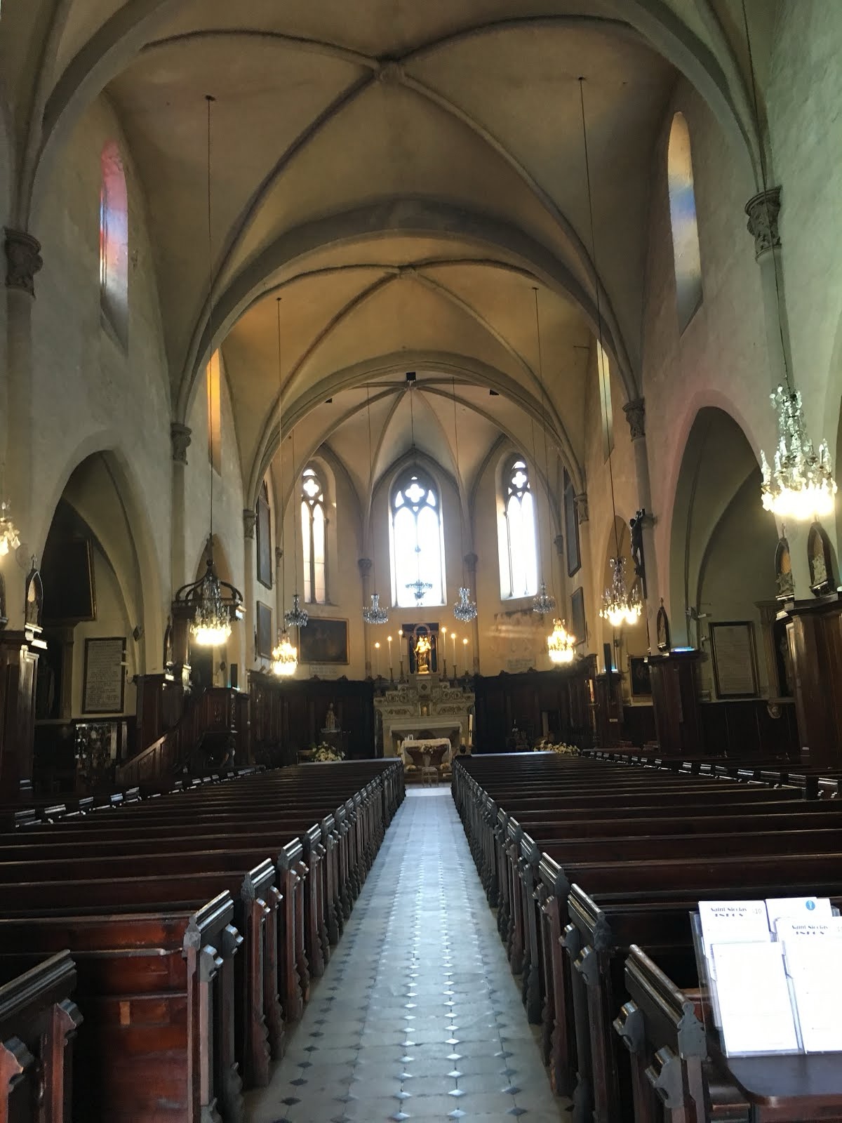 At the top of the hill was Eglise Notre Dame d'Esperance (The Church of Our Lady of Hope). It happened to be open when we were there, likely because a funeral was soon to take place, judging by the black-clad folks who were gathering as we exited.