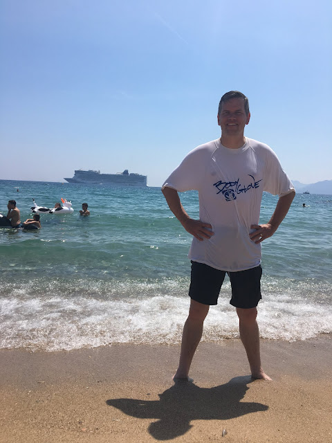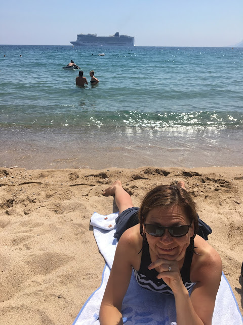 You can see where our ship is anchored in the distance. After walking all around town on a warm day, it felt great to swim in the Mediterranean Sea. (This beach also has a net to keep out the jellyfish).
