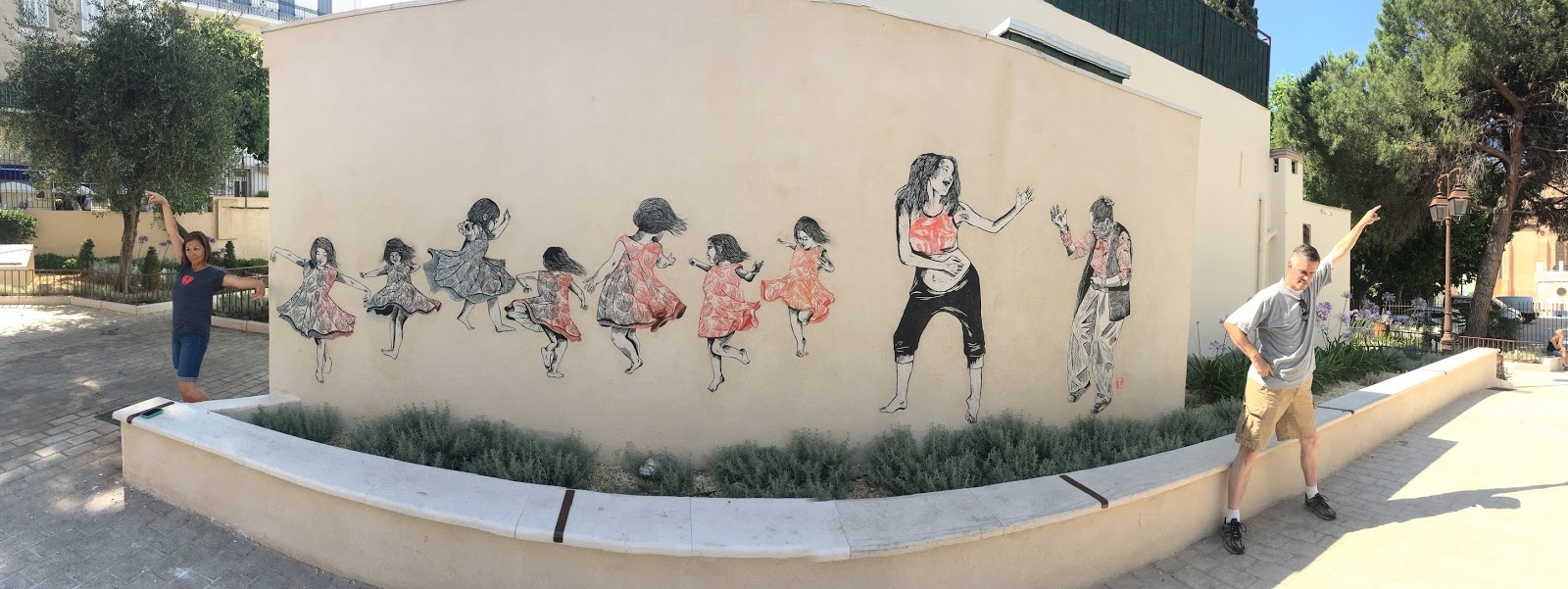 Linette and I wandered into a little park and saw these dancers on the wall, so I started a panorama, and then Linette ran and grabbed the camera from me to finish it off so I could be in it, too. With my sweet moves.