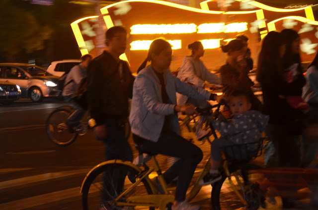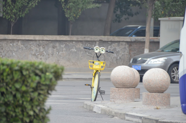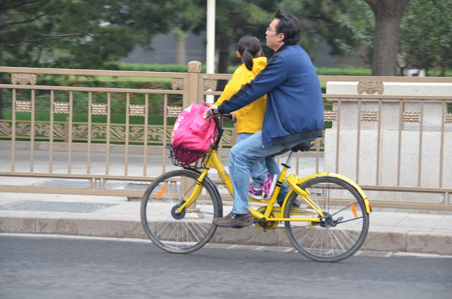 These yellow city bicycles are everywhere. Apparently you get an app that lets you unlock one wherever you find it, then you ride it to wherever (for a tiny sum) and lock it up again, and it's ready for whoever else needs one. I think it has cellular built into the locking mechanism so the apps can know where all the available bikes are. And no charge for extra passengers.